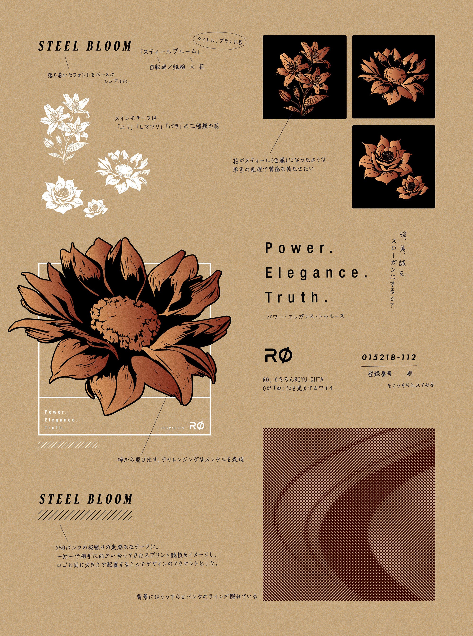 タイトル “STEEL BLOOM” は「鋼の花」を意味します。これは「強く、美しく花を咲かせたい」――そんなイメージで日々のトレーニングを重ねる、自身の心構えからのインスピレーション。デザインモチーフには 薔薇・ユリ・ひまわり の3種類の花を採用し、それぞれが持つ個性と美しさを通して「強さ」や「優しさ」「明るさ」を表現しました。また、スローガンである “Power. Elegance. Truth.” には、「強・美・誠」という、タイトルにも通じるメッセージが込められています。